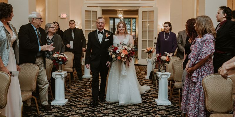 Fall weddings can be a little iffy weather-wise, and for Jordan and Adam’s wedding, they saw firsthand that things got a little slippery. However, they handled things swimmingly! Their day was full of love and laughter, and will certainly be a great event to remember. The groom wore a classic tuxedo style that matched the bride perfectly, and their chosen color palette of fall colors complimented the venue greatly. We loved the personal touch that they included on their table decorations as well! Having that walk down memory lane provided the guests with their full love story, and made their wedding so much more unique. Take a look at the pictures below, and be reminded that love can conquer any hurdle!