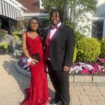 A bride in a white gown stands beside a groom in a black tuxedo on outdoor stone steps, with her arm wrapped around his, both looking at the camera with a serene expression.